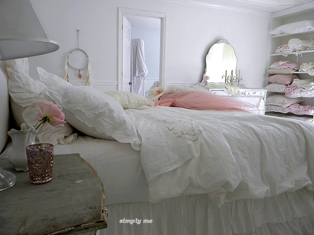 Hace unos meses conocí el maravilloso blog de Tausha, Simply Me, y desde entonces he estado desempolvando la ropa de cama que tengo guardada y comprando en Laura Ashley (sobretodo en liquidación) para renovar todo lo que tengo y darle un toque de romanticismo a las camas, como lo hace Tausha con la gracia, soltura y glamour que le imprime a sus camas... algo he logrado, pero nunca como ella, y además no tengo la linea Simply Shabby Chic, de Rachel Ashwell, que usa Tausha por toda su casa, no sólo en las camas sino que en los sillones de su estar, en la terraza y la piscina, incluso en las mesas y sillas y también por el suelo.